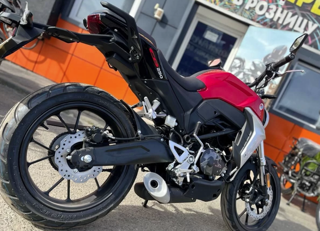 Качественные покрышки на 17" ободах, 110/70 и140/70, обеспечивают отличное сцепление с дорожным покрытием. Рама дуплексная, профилированная, усиленная ребрами жесткости. Удобное мягкое сиденье и жидкокристаллическая цветная панель приборов с подсветкой - заставят радоваться комфорту и удобству.